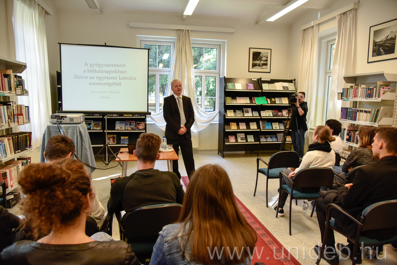 Az áprilisig tartó rendezvénysorozatban havonta más-más tudományterület neves képviselői tartanak előadásokat a gimnazistáknak. Első alkalommal – a gyógyszerészek világnapja alkalmából – Vecsernyés Miklós, a Gyógyszerésztudományi Kar dékánja avatta be a szakma szépségeibe és nehézségeibe a biológia fakultációra járó tanulókat.