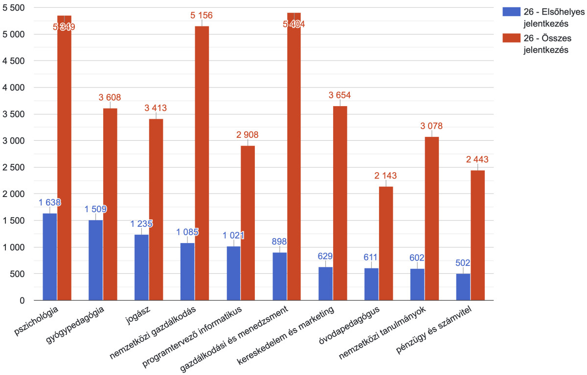 A legnépszerűbb szakok a pszichológia, a gyógypedagógia, a jogász, a nemzetközi gazdálkodás, valamint a programtervező informatikus képzések voltak. Az ELTE számára kiemelt jelentőségű pedagógusképzési területre jelentkezők száma idén közel 900 fővel növekedett az előző évhez képest. Ezzel az Eötvös Loránd Tudományegyetem a hazai pedagógusképzésben az országos növekedés 25%-át érte el idén.