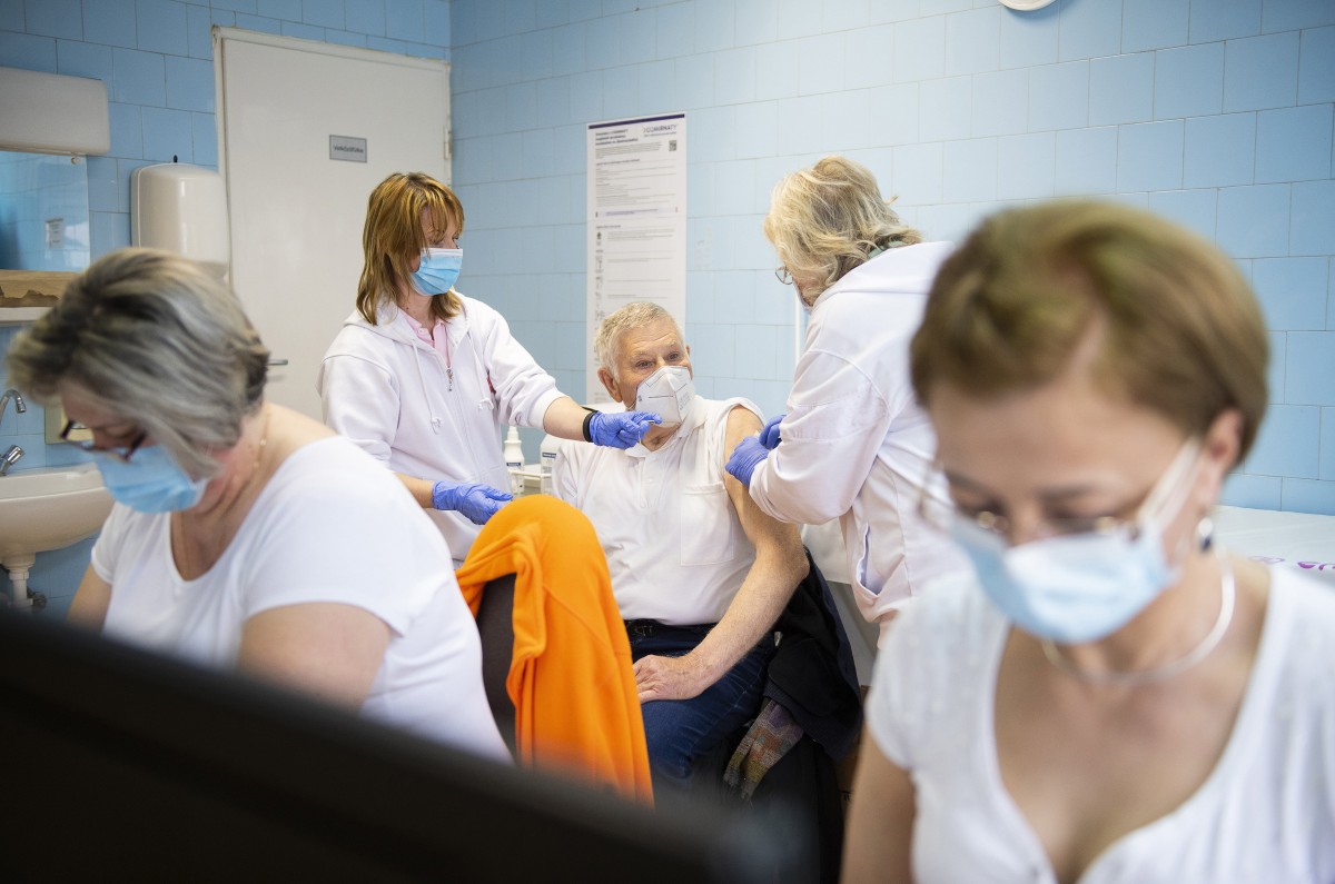 Szabó Éva ortopédsebész főorvos beolt egy férfit a német-amerikai fejlesztésű Pfizer-BioNTech koronavírus elleni oltóanyag, a Comirnaty-vakcina második adagjával a nyíregyházi Jósa András Oktatókórházban kialakított oltóponton 2021. április 24-én.