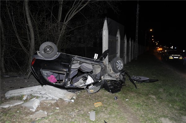 Kerítésnek ütközött, összeroncsolódott személyautó Piliscsabán 2021. április 25-én este. A sofőr megpróbálta elhagyni a helyszínt, utasa meghalt. MTI/Mihádák Zoltán
