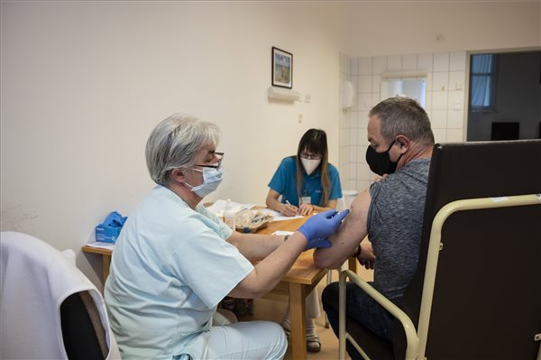 Vargyai Éva főorvos beolt egy férfit a német-amerikai fejlesztésű Pfizer-BioNTech koronavírus elleni oltóanyag, a Comirnaty-vakcina második adagjával az egri Markhot Ferenc Kórházban kialakított oltóponton 2021. április 29-én. MTI/Komka Péter