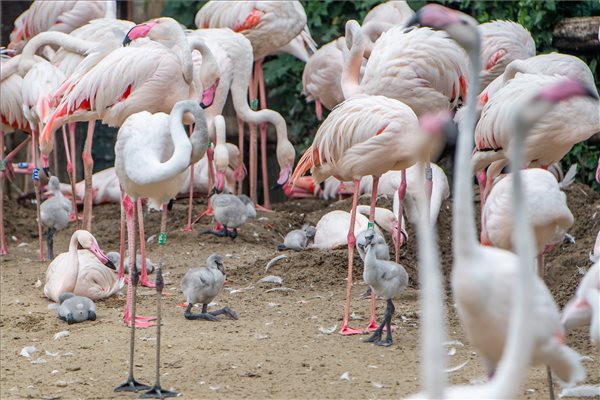 Az elmúlt két hétben kikelt flamingófiókák a Fővárosi Állat- és Növénykertben 2021. július 19-én. Idén eddig összesen húsz flamingófióka kelt ki a budapesti állatkertben, de hamarosan továbbiak kikelése is várható.