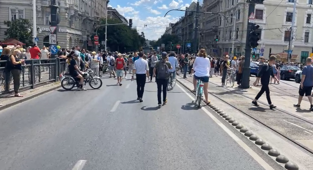 A rendőrök felszólították a tüntetőket, hogy ne akadályozzanak meg másokat a szabad mozgásban, és az úttestről menjenek a járdára.