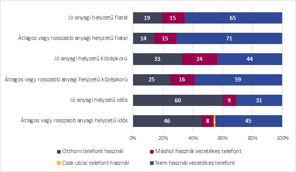 A vezetékes telefon fennmaradásának másik fő oka az életkorból fakadó megszokás, illetve a kor és az anyagi helyzet együttesen. A legnagyobb arányban a magukat jómódúnak mondó idősek használják – 69 százalékuk –, ami 1,3 millió embert jelent. A legkevésbé az átlagos vagy rossz anyagi helyzetű fiatalok veszik igénybe, ennek a csoportnak konkrétan a 29 százaléka, de még a jó körülmények között élő középkorúaknak is csak 57 százalékuk.
