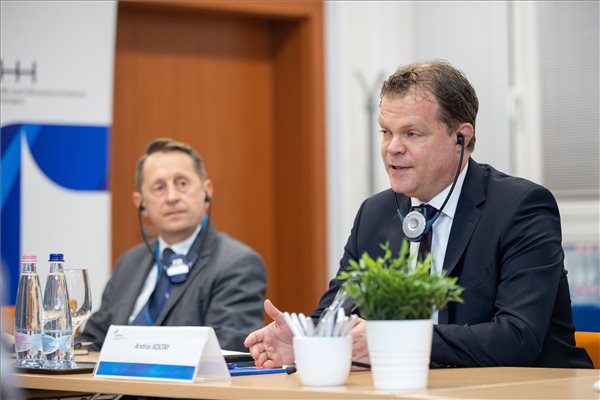 Fotó: Az NMHH által közreadott képen Koltay András, a Nemzeti Média- és Hírközlési Hatóság (NMHH) elnöke (j) a magyar médiapiac helyzetéről, a médiapluralizmus érvényesüléséről, valamint az uniós jogszabályok hazai alkalmazásáról tájékoztatja az Európai Parlament (EP) kulturális és oktatási bizottságának Magyarországon tartózkodó küldöttségét az NMHH székházában Budapesten 2022. november 4-én. MTI/NMHH