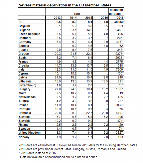 Az Eurostat felmérése szerint ma hazánkban a lakosság 16.2 százaléka, bő másfél millió ember tartozik a legsúlyosabb nélkülözők közé, ennél rosszabb csak Romániában rosszabb a helyzet, ahol ugyanez az arány 23.8 százalék.A 2016-os adatok szerint az Európai Unió lakosságának 7.8 százaléka, közel 39 millió ember él súlyos nélkülözésben.