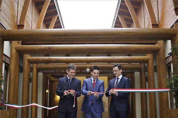 Szalacsi Árpád a Nyírerdő Zrt. vezérigazgatója (b), Bitay Márton Örs, a Földművelésügyi Minisztérium állami földekért felelős államtitkára (k) és Papp László polgármester (Fidesz-KDNP) átvágja a nemzeti színű szalagot a Nyírerdő Zrt. debreceni erdészeti iskolájának avatásán 2015. december 11-én. MTI Fotó: Czeglédi Zsolt