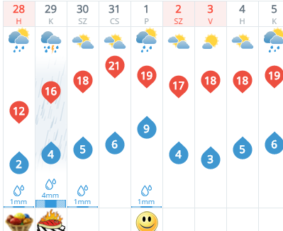 Pénteken, április elsején erősen megnövekszik a felhőzet, szórványosan valószínű zápor, helyenként zivatar, a szél is megerősödhet. A minimumhőmérséklet 7-13, a maximumhőmérséklet általában 18-23 fok között valószínű, északnyugaton lehet délután ennél kissé hűvösebb.