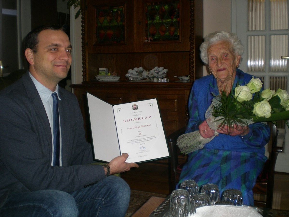 A debreceni Vass György Mártonné 2017. december 15-én lett 95 éves. Ebből az alkalomból aznap otthonában köszöntötte őt Hernádi Zoltán önkormányzati képviselő és Siposné Hüse Judit, a polgármesteri hivatal szociális osztályának munkatársa.