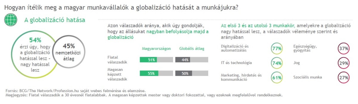 Magyarországon a válaszadók több mint fele (54 százaléka) gondolja úgy, hogy a globalizációnak hatása lesz az állására, szemben a globális 45 százalékos átlaggal, míg a technológiai változások hatását majdnem ugyanannyian becsülik fontosnak (48 százalék).