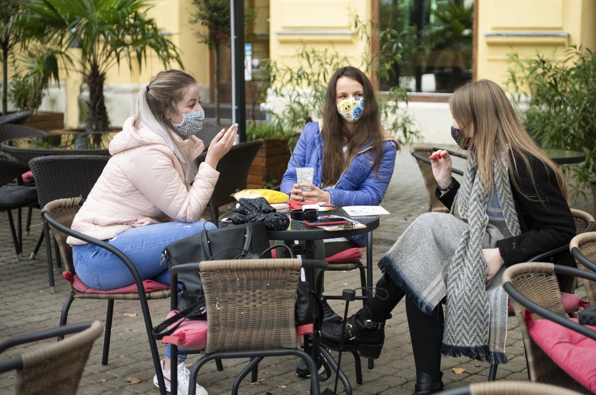 Védőmaszkot viselnek egy kávézó vendégei a koronavírus-járvány második hulláma miatt Nyíregyházán.