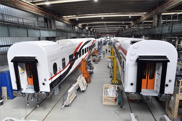 Az egyiptomi nemzeti vasúttársaságnak készülő vasúti személykocsik a Dunakeszi Járműjavítóban 2021. május 3-án. A magyar vasúti járműgyártás az eddigi legnagyobb megrendelését kapta az egyiptomi nemzeti vasúttársaságtól, ami a két ország közötti gazdasági együttműködés valaha volt legkomolyabb eredménye, valamint a magyar ipar történetének egyik legnagyobb exportügylete, hangsúlyozta idén február 23-án Szijjártó Péter külgazdasági és külügyminiszter az Alexandriában tartott sajtótájékoztatón. MTI/Máthé Zoltán