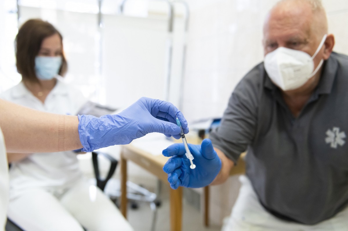 Az asszisztens átadja Bárdos Lajos pszichiáter főorvosnak a német-amerikai fejlesztésű Pfizer-BioNTech koronavírus elleni oltóanyaggal, a Comirnaty-vakcina második adagjával töltött fecskendőt, mielőtt beoltana egy nőt Nagykállóban a Szabolcs-Szatmár-Bereg Megyei Kórházak és Egyetemi Oktatókórház Sántha Kálmán Szakkórházában kialakított oltóponton 2021. május 4-én.