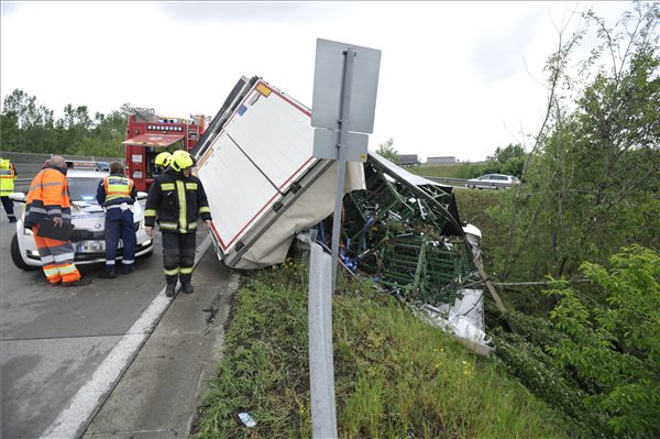 Az árokba csúszott, felborult kamion Gyál közelében, az M0-ás autóútról az M5-ös autópályára vezető felhajtón, Szeged irányában 2021. május 13-án. A kamion sofőrjét súlyos sérülésekkel vitték kórházba. MTI/Mihádák Zoltán