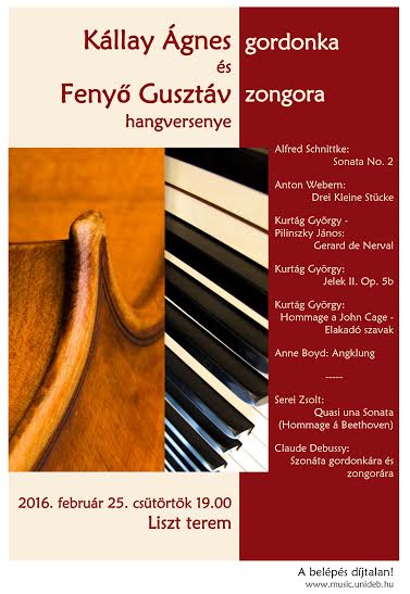 Fenyő Gusztáv Skóciában élő zongoraművész és Kállay Ágnes gordonkaművész, a Liszt Ferenc Zeneművészeti Egyetem tanára ad kamarahangversenyt, amelyet február 25-én, csütörtökön rendeznek a Zeneművészeti Kar Liszt termében.A hangversenyre a belépés díjtalan.