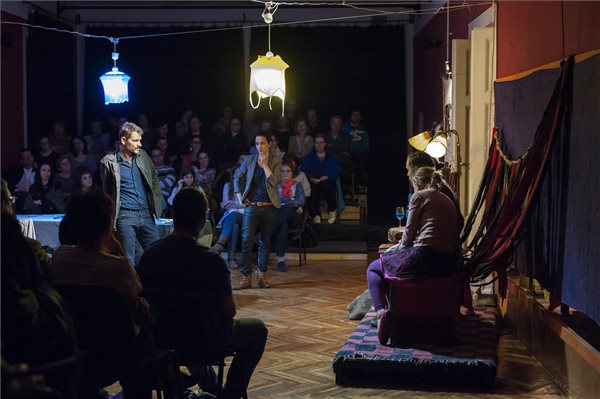 Hajdu Szabolcs (b) Farkas, Török-Illyés Orsolya (b2) Eszter, Szilágyi Ágota (j, elöl) Laura és Szabó Domokos (j, hátul) Albert szerepében Hajdu Szabolcs Ernelláék Farkaséknál című darabjának előadásán a debreceni Páholy Lakásszínházban 2016. március 23-án. A színdarabot a budapesti Maladype Színház társulata adta elő a X. Deszka Fesztiválon. MTI Fotó: Czeglédi Zsolt