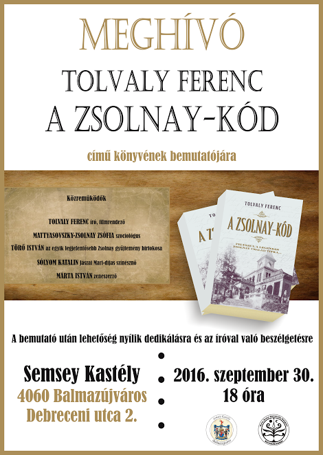 2016. szeptember 30-án 18 órától Balmazújvároson a Semsey Kastélyban könyvbemutatót tartanak. A könyv írója Tolvaly Ferenc, könyvének címe pedig “A Zsolnay-kód”.