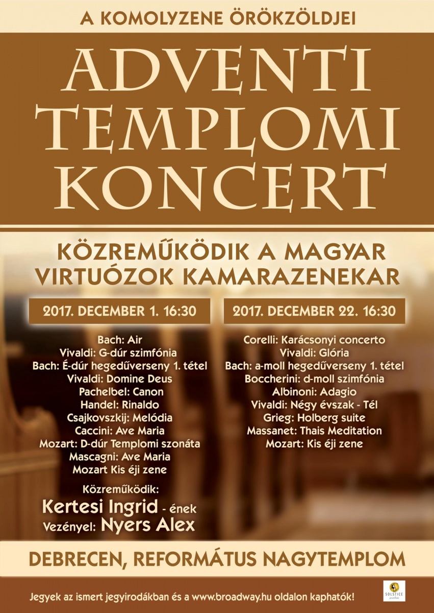 A hazánk egyik legfoglalkoztatottabb zenekaraként számon tartott vonóscsapat évek óta koncertezik az adventi időszakban templomokban, és idén a Debreceni Református Nagytemplomba két alkalommal is ellátogatnak, a karácsonyi időszak kezdetén és végén. A pénteki, december 1-jei koncert vendége Kertesi Ingrid, Liszt Ferenc-díjas magyar opera énekesnő, és a klasszikus zene legnagyobb neveitől csendülnek fel zeneművek, mint például Bach, Vivaldi, Mozart és Csajkovszkij darabjai. A karácsonyhoz közeledve, december 22-én ismét visszatérnek a Virtuózok a Debreceni Református Nagytemplomba, ahol Corelli: Karácsonyi concertóját követően ismét terítékre kerülnek többek között Bach, Vivaldi és Grieg művei, majd az előadást Mozart Kis éji zenéjezárja.