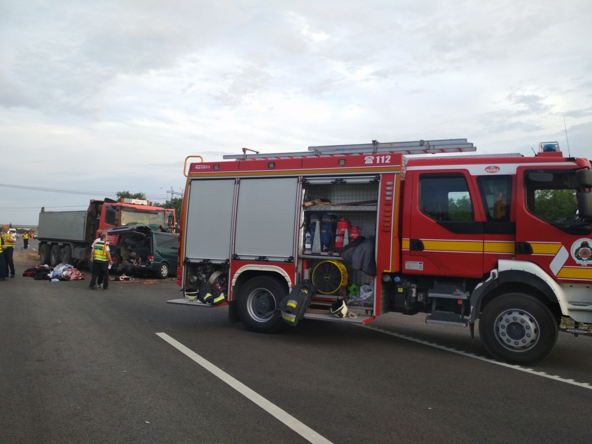 András Tamás elmondta, hogy a kisbusz egy homokszállító teherautóval ütközött a 4-es főúton, a teherautó vezetője könnyebb sérüléseket szenvedett.