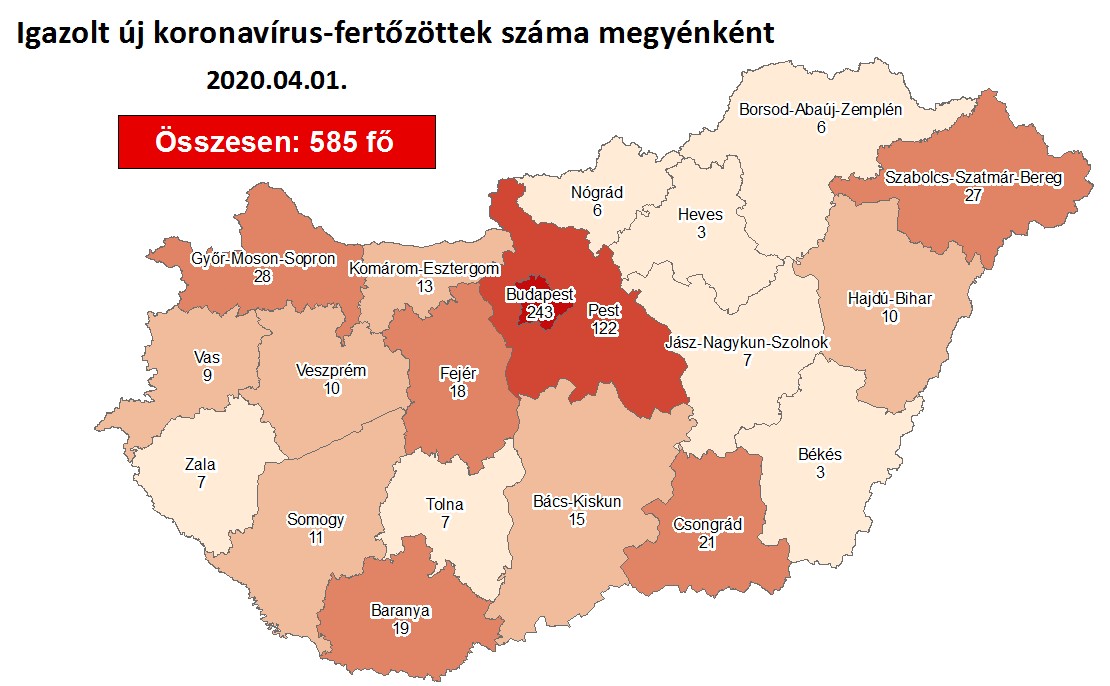 Ötszáznyolcvanötre emelkedett az azonosítottan koronavírus-fertőzöttek száma Magyarországon – írta a koronavirus.gov.hu csütörtök reggel. A térképes adatok alapján továbbra is Budapesten van a legtöbb fertőzött.