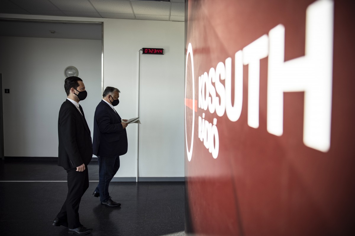 Orbán Viktor kormányfő (j2) érkezik a Kossuth rádió stúdiójába MTI/Miniszterelnöki Sajtóiroda/Fischer Zoltán