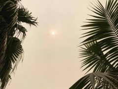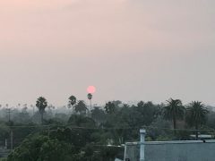 Venice Beach, Los Angeles egyik tengerparti városrésze így nézett ki 2020.09.13-án délután egykor illetve a tengerpart és a házak fölötti ég a naplementében. Az égő erdők füstje apokaliptikus látványt nyújt. Így szabadon látható a Nap. Időközben a füst Magyarország légterét is elérte. Fotók: Vida Virág